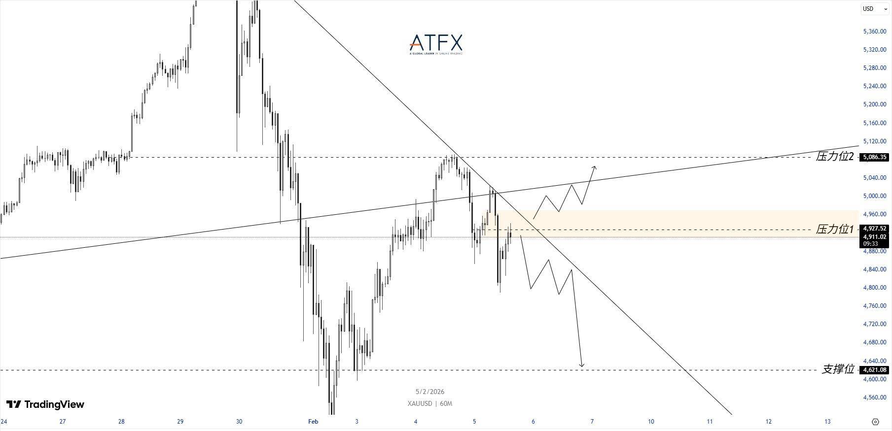 技术结构方面,结合图表可以看到,当前金价正运行在一条自前高延伸下来的下降趋势线下方,反弹多次在趋势线与前期密集成交区重合的位置受阻,显示4920–5000美元区域已成为短线关键压力带。在该区域下方,价格更多呈现为震荡整理而非趋势性下跌,说明多头并未全面撤离,而是在等待新的方向性信号。若后续金价能够有效突破并站稳该压力区,并重新回到下降趋势线上方,则上方将打开测试5080美元甚至更高区域的空间;反之,若反弹持续受阻并跌破当前结构支撑,价格可能顺势沿趋势线方向走弱,先行测试4800美元附近,一旦该位置失守,中期下行空间将进一步指向4620美元一线的重要支撑区域。整体而言,当前技术形态更偏向于“方向选择前的高位拉锯”,市场通过宽幅震荡来消化前期的急涨急跌。展望后市,黄金短期走势将高度依赖美国就业数据与美元方向的变化,同时也需密切关注地缘局势的任何突发进展,在关键风险事件落地前,金价大概率仍将在区间内反复震荡,但在全球不确定性高企的背景下,黄金中长期的避险与配置价值依然难以被动摇。