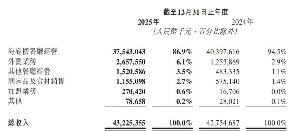报告期内,海底捞实现收入432.25亿元,同比增长1.1%。其中,绝大部分的收入来自餐厅经营,而主品牌海底捞的营收下滑。据公告,2025年海底捞餐厅经营收入375.43亿元,同比下降7.07%;外卖业务收入为26.58亿元,同比增长111.9%;其他品牌餐厅收入为15.21亿元,较上年增长显著。