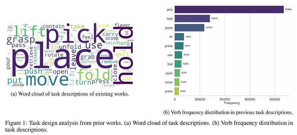 任务设计过程中,研究团队先对人类与物体的交互原语进行了系统分析,然后借助大语言模型生成候选任务,再经过专家筛选与优化,最终形成100个任务。这些任务从日常常见到罕见,从简单到复杂。
