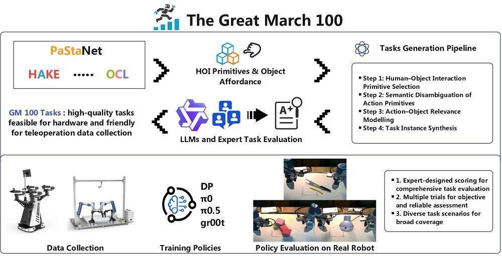 结语:GM-100将进一步扩展,不怕干“脏活累活”李永露告诉我们,团队不会止步于GM-100数据集的发布。GM取自“Great March”,寓意“长征”,团队将逐步把任务库扩展至300乃至1000项,并推进跨机器人平台评测,以增强评测的覆盖面。