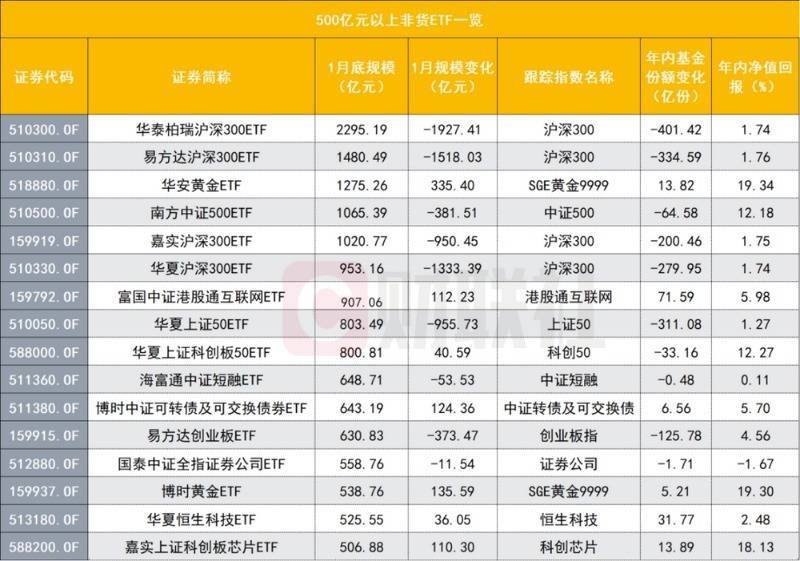 而千亿级别的ETF则从12月的7只减少至1月的5只。华夏沪深300ETF、华夏上证50ETF、易方达创业板ETF等3只曾经的千亿级的宽基ETF,最新规模均回落至千亿元之下。