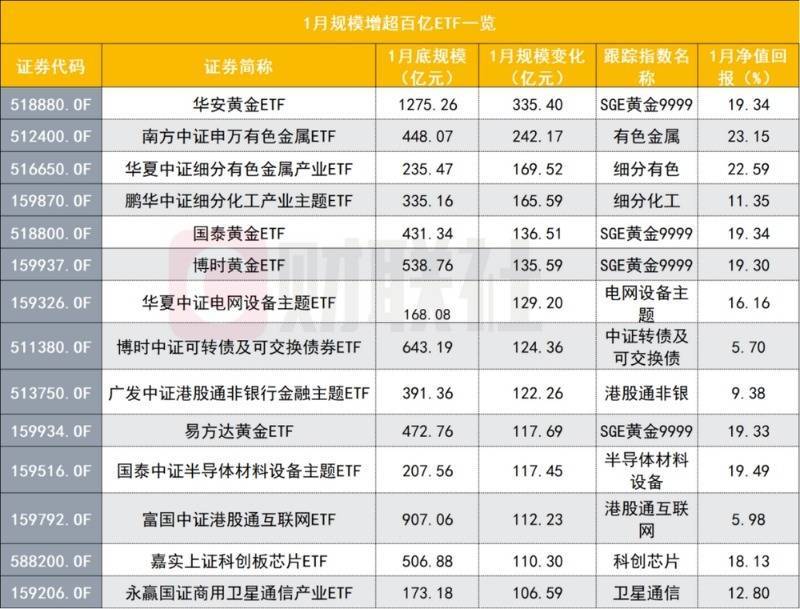 新增了1只千亿级和1只500亿级别ETF,黄金主题ETF也是1月规模增长最多的。数据显示,黄金主题ETF合计在1月规模增长820.73亿元,至3009.63亿元。除了前述2只黄金主题ETF,国泰基金和华夏基金旗下的黄金主题ETF也在1月规模增超百亿元。
