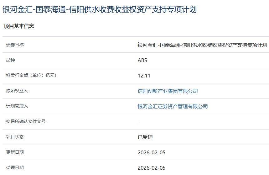 【大河财立方消息】2月5日,银河金汇-国泰海通-信阳供水收费收益权资产支持专项计划项目获上交所受理。该债券拟发行金额为12.11亿元配资之家平台,原始权益人为信阳创新产业集团,计划管理人为银河金汇证券资产管理有限公司。
