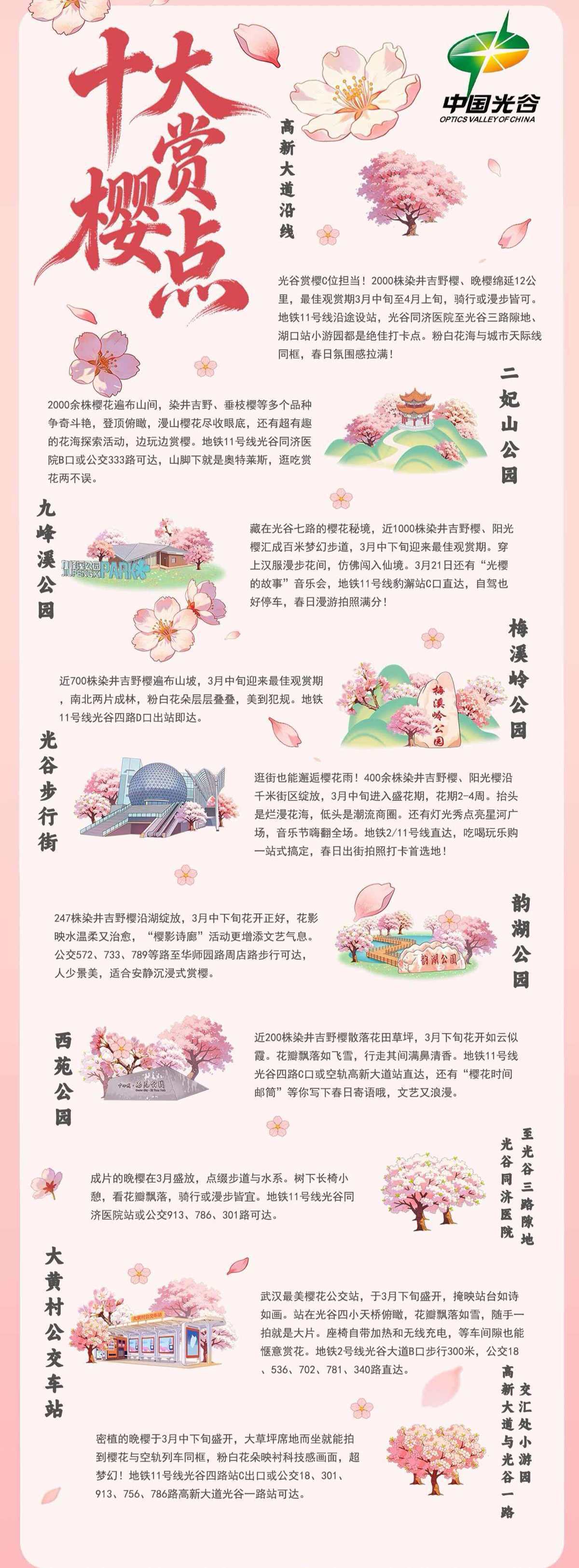 连日天气晴好,武汉多处早樱已盛开,层层叠叠、热烈惊艳!想赏樱却害怕人挤人?别再扎堆啦!12公里高新大道数千株樱花树即将绽放,还有步行街、公园、街角车站等多处赏樱点各有风情。从粉白早樱到烂漫晚樱,从花海打卡到特色樱花活动,超全光谷赏樱攻略来喽。