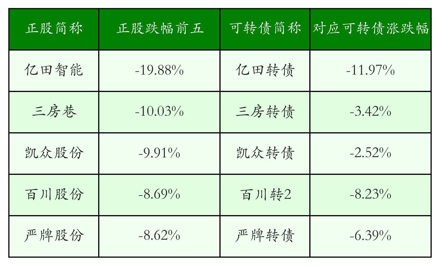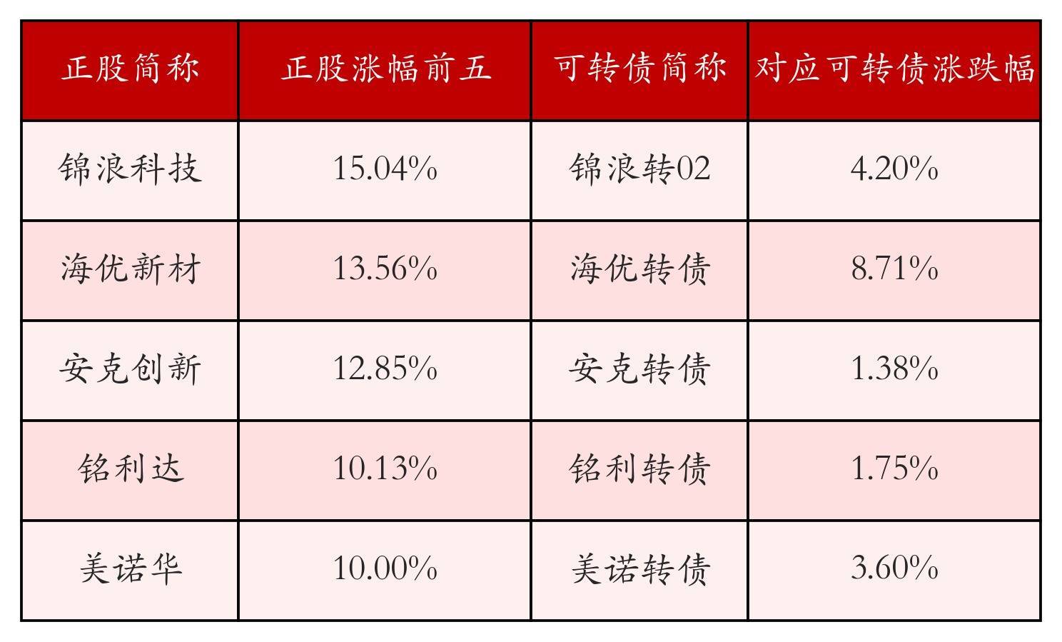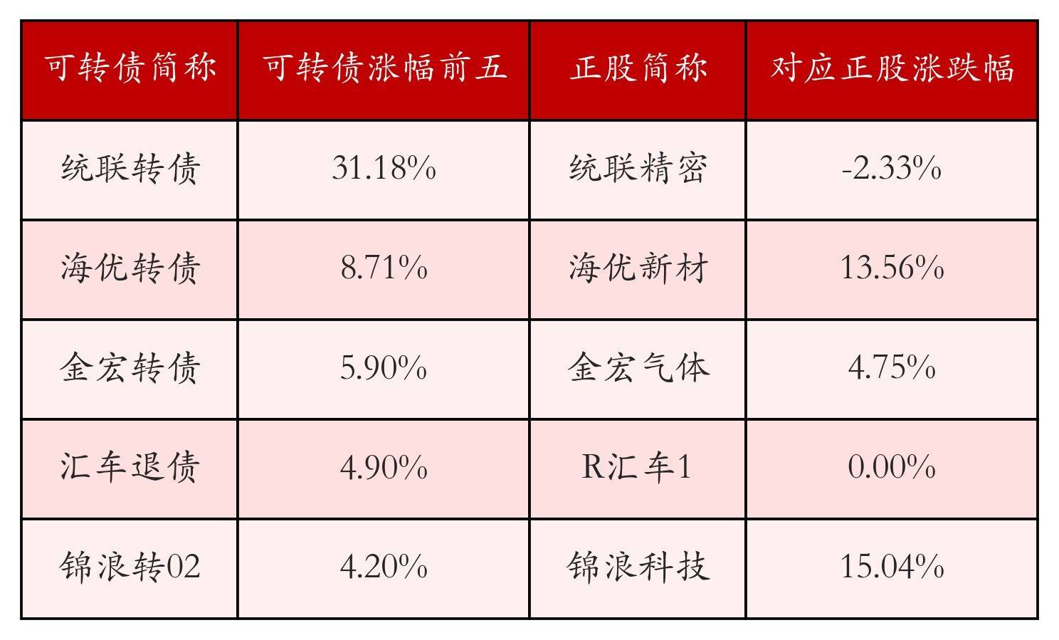 南财智讯3月20日电,盘后数据显示,债市方面,中证转债指数收跌0.58%,报492.62,成交额为658.37亿元。可转债方面合肥配资公司,今日共成交357只可转债合肥配资公司,其中63只收涨,0只收平,294只收跌。具体来看,19只可转债涨幅超过2%。其中统联转债(118066)涨31.18%,海优转债(118008)涨8.71%,金宏转债(118038)涨5.9%。今日有61只可转债跌幅超2%,亿田转债(123235)跌11.97%,龙大转债(128119)跌9.88%,东时转债(113575)跌8.49%。存在交易量的可转债所对应的正股中,62只收涨,3只收平,292只收跌。具体来看,13只可转债对应正股涨幅超过5%,其中,。同时所对应的可转债:。今日有35只可转债对应正股跌幅超过5%,三房巷(600370)跌停,收跌10.03%。同时所对应的可转债:三房转债(110092)同跌3.42%。