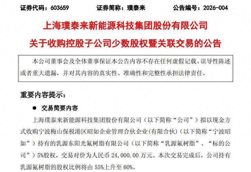1月27日,璞泰来(603659)公告称,公司拟以现金方式收购宁波昭如持有的乳源氟树脂5%股权,交易对价为2.4亿元。本次交易完成后,公司持有乳源氟树脂的股权比例将由55%上升至60%。