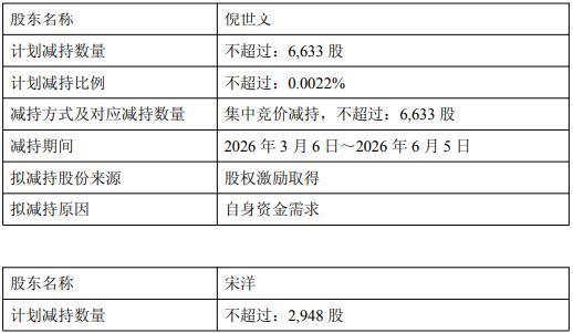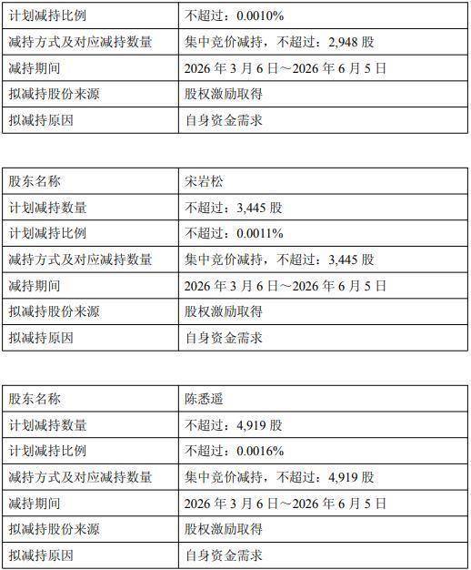倪世文拟减持数量不超过6633股,占公司总股本的比例不超过0.0022%;宋洋拟减持数量不超过2948股,占公司总股本的比例不超过0.0010%;宋岩松拟减持数量不超过3445股,占公司总股本的比例不超过0.0011%;陈悉遥拟减持数量不超过4919股,占公司总股本的比例不超过0.0016%。