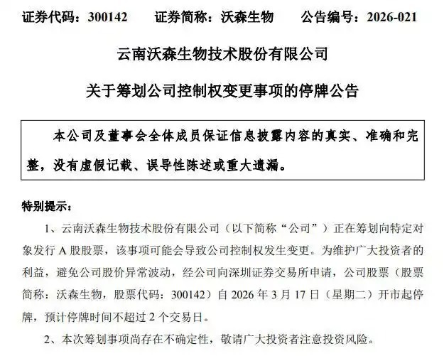 3月16日,沃森生物(300142)公告,公司正在筹划向特定对象发行A股股票,该事项可能会导致公司控制权发生变更。公告显示,目前,各方主体正在就具体方案、协议等相关事项进行论证和磋商,具体情况以各方最终签署的相关协议为准。